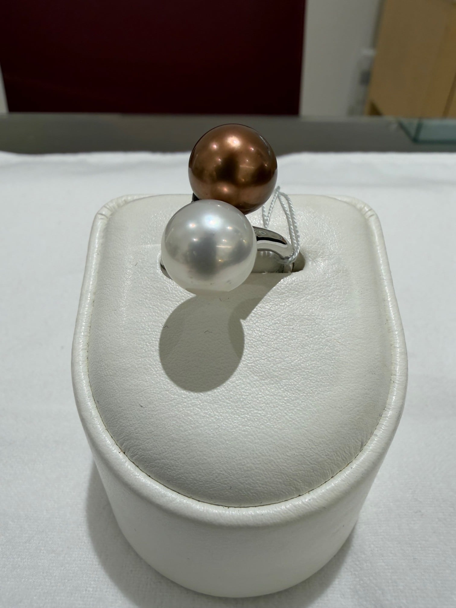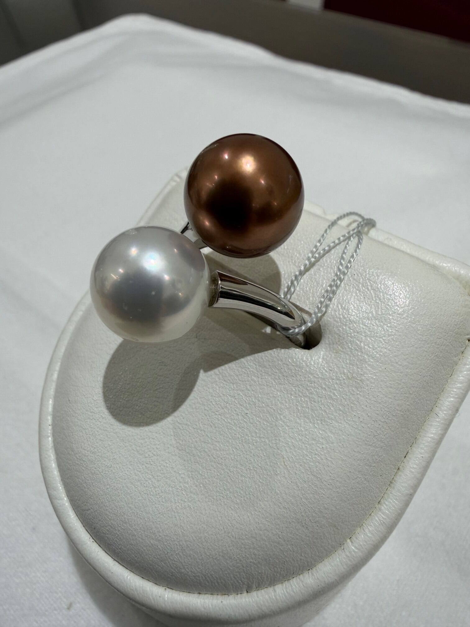 約11.5〜12.0mmの南洋真珠を2珠あしらった、存在感のあるデザイン。ホワイト系パールとブラウン系パール、それぞれの個性ある色合いと豊かな照りが、手元に洗練された華やかさをもたらします。