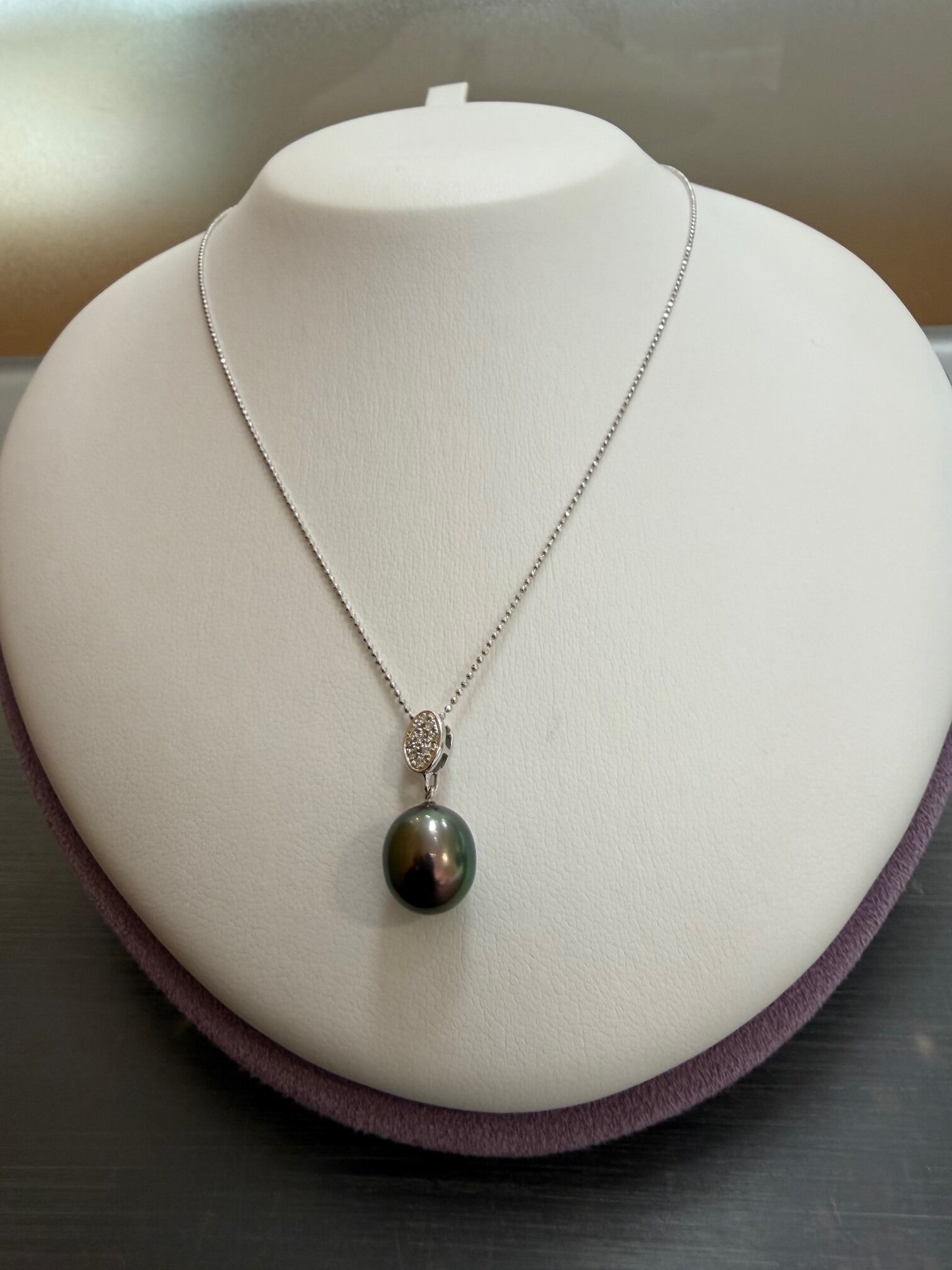K18WGネックレス40cm 南洋真珠 黒10mm珠 0.08ctダイヤモンド使用